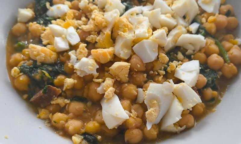 Este es uno de los platos reconfortantes que me encanta preparar cuando llega el frío y tengo poco tiempo. Está inspirado en la receta de garbanzos con espinacas y huevo del libro La comida de la familia del equipo de el Bulli y Ferrán Adriá. ¡Allá vamos!