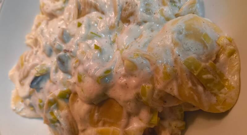 Para empezar, hay que cortar el puerro en juliana tan fino como se pueda y sofreirlo con la mantequilla en la sarten junto a los dientes de ajo laminados. Si se decide hacer la receta con piñones, habrá que tostarlos un par de minutos en la mantequilla antes de añadir el puerro y el ajo.